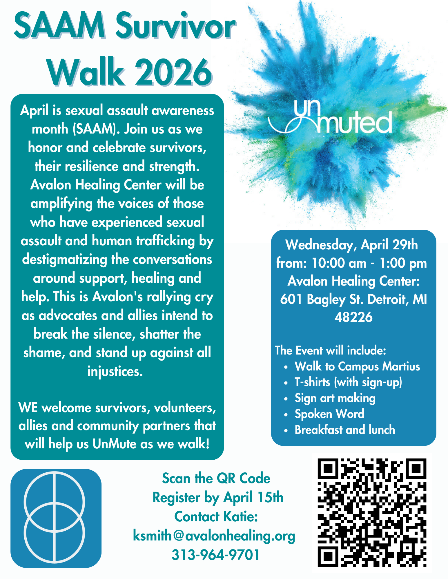 The Avalon Healing Center 2026 Survivor walk will take place on April 29, 2026! This event is free to all and each participant will receive a T-shirt and lunch. Please fill out the form below to register! If you have any questions or something changes please reach out to by calling 313-964-9701. We look forward to seeing you there!